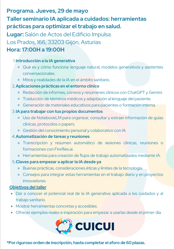 Taller seminario IA aplicada a cuidados: herramientas prácticas para optimizar el trabajo en salud.